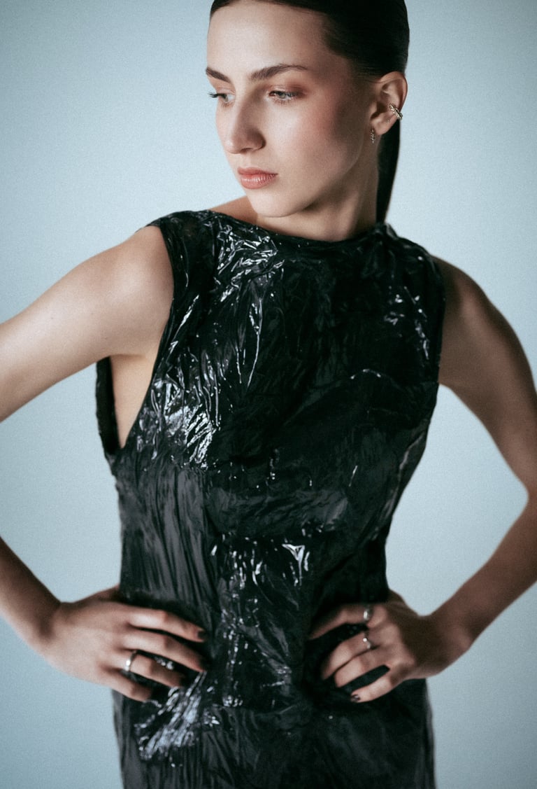 Moteris stovi prie šviesaus fono, rankas laikydama ant klubų, galvą lengvai pasukusi į kairę ir žvilgsnį nukreipusi žemyn. Ji vilki juodą, itin blizgią suknelę, pagamintą iš išlydyto plastiko, suformuoto karšto oro pistoletu. Paviršius nelygus, banguotas, o blizgesys stikliškas – lyg drabužis būtų šlapias.