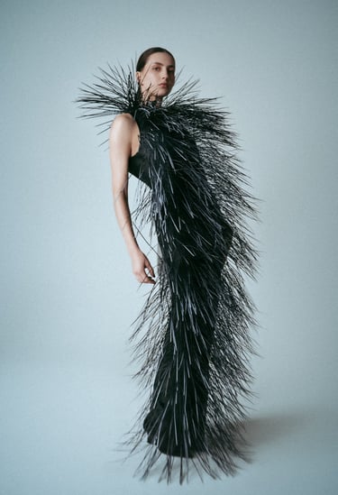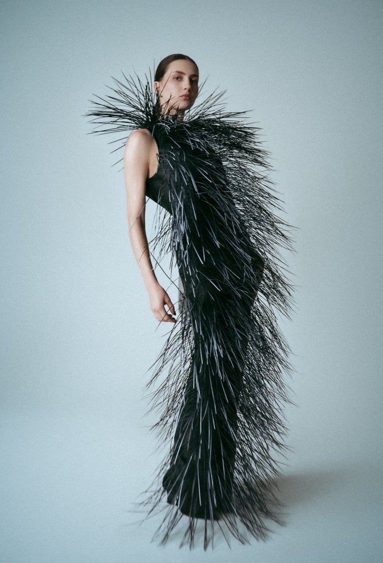 Moteris vilki ilgą juodą, kūną apglėbiančią suknelę, kurios pagrindinis akcentas – masyvi trimatė dekoracija iš kelių šimtų juodų plastiko laidų suveržėjų, kurie suformuoja tankų pluoštą aplink pečius, kaklą, šoną ir leidžiasi iki žemės, primindami išsikišančius plastiko spyglius. Jie kyla įvairiomis kryptimis ir sukuria skulptūrišką, platų siluetą.