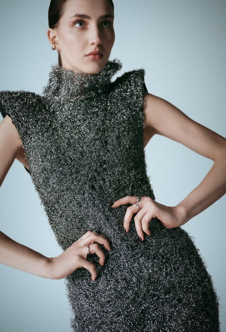 Moteris stovi prie šviesaus fono, žvilgsnį nukreipusi į šoną. Ji vilki plieno spalvos suknelę, pagamintą iš šiurkščios metalinės kempinės: paviršius nelygus, tarsi sudarytas iš smulkių metalinių siūlų. Suknelė turi plačius, kampuotus pečius ir aukštą, standžią apykaklę, kuri šiek tiek išsilenkia į dešinį šoną. Moteris rankas laiko ties juosmeniu, o jos pirštus puošia keli ploni sidabriniai žiedai, kontrastuojantys su grubia suknelės tekstūra.