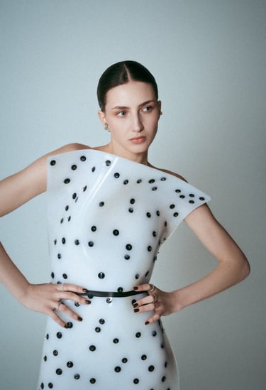 Tamsiaplaukė moteris stovi prie šviesaus fono, galvą lengvai pasukusi į kairę. Ji vilki skulptūrišką, iš balto silikono suformuotą blizgų drabužį, ties pečiais platėjantį į trapecės formą. Silikone užlietos mažos juodos sagos, tankiai ir ritmiškai išsidėsčiusios per visą paviršių. Ties liemeniu matyti plonas juodas dirželis, subtiliai pabrėžiantis figūrą.