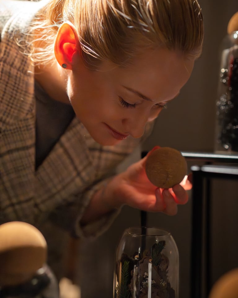 „Pasimatuok kvapą“ – tai patyriminė edukacija tamsoje, kviečianti leistis į kvapų kelionę per jausmus, prisiminimus ir vaizduotę. Čia rega nutyla, o uoslė tampa pagrindiniu vedliu: uostydami, klausydamiesi ir jausdami dalyviai tyrinėja savo vidinį pasaulį ir per pojūčius kuria asmeninę patirtį..